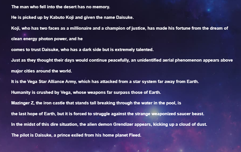 ظهر في الفيديو التشويقي أن دوق وجد في الأرض فاقدًا لوعيه حتى أنه لم يكن يعرف اسمه، ثم ظهر في فيديو آخر وهو يستنكر اسمه وكأنه يتعرف عليه أو كأن أحدًا يلفنه إياه، وذكر في النبذة التعريقية أن جريندايزر سيظهر فجأة بعد ظهور مازينجر، هذا يعني أن دوق لن يكن على علم بمكان جريندايزر في بداية القصة، وربما سيلتقي بماريا أو ستبحث هي عنه حتى تجده، وهي ستعرفه باسمه، وبعدها سيظهر بزيه العسكري، وظهور جريندايزر من المحتمل جدًا أن يقترن بهيكارو والجزيرة التي تعيش فيها.