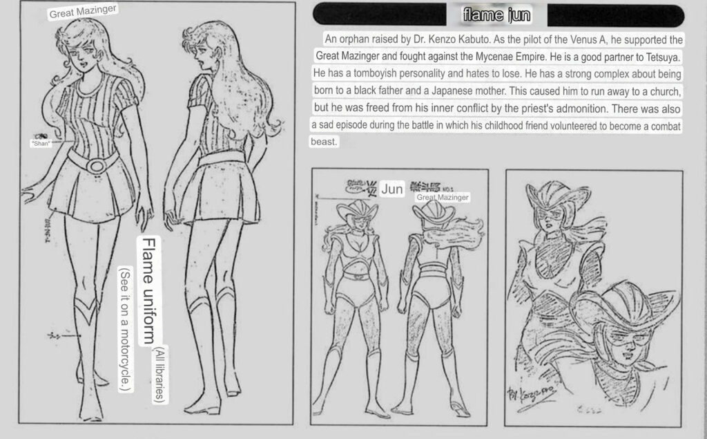 She kept as a child An orphan raised by Dr. Kenzo Kabuto. As the pilot of the Venus A, She supported the Great Mazinger and fought against the Mycenae Empire. She is a good partner to Tetsuya. She has a tomboyish personality and hates to lose. She has a strong complex about being born to a black father and a Japanese mother. This caused her to run away to a church, but she was freed from her inner conflict by the priest’s admonition. There was also a sad episode during the battle in which her childhood friend volunteered to become a combat beast.