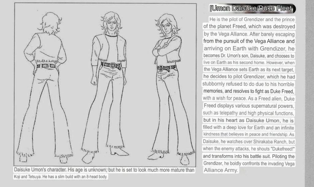 He is the pilot of Grendizer and the prince of the planet Freed, which was destroyed by the Vega Alliance. After barely escaping from the pursuit of the Vega Alliance and arriving on Earth with Grendizer, he becomes Dr. Umon’s son, Daisuke, and chooses to live on Earth as his second home. However, when the Vega Alliance sets Earth as its next target, he decides to pilot Grendizer, which he had stubbornly refused to do due to his horrible memories, and resolves to fight as Duke Freed, with a wish for peace. As a Freed alien, Duke Freed displays various supernatural powers, such as telepathy and high physical functions, but in his heart as Daisuke Umon, he is filled with a deep love for Earth and an infinite kindness that believes in peace and friendship. As Daisuke, he watches over Shirakaba Ranch, but when the enemy attacks, he shouts “Dukefreed!” and transforms into his battle suit. Piloting the Grendizer, he boldly confronts the invading Vega Alliance Army.