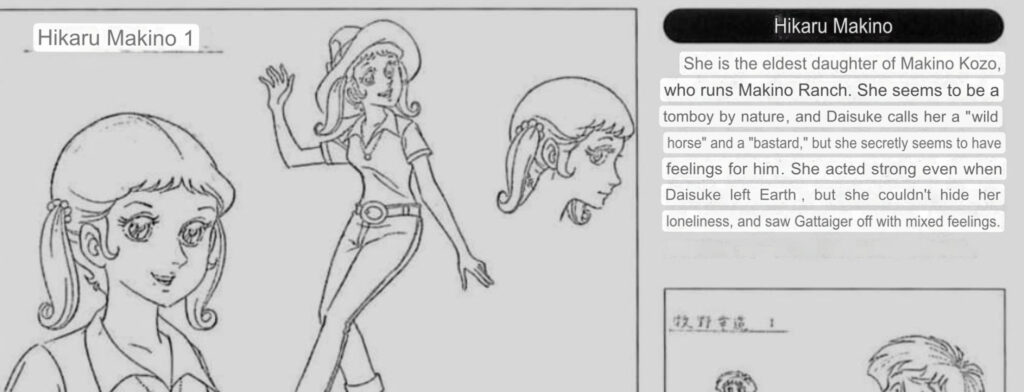 She is the eldest daughter of Makino Kozo, who runs Makino Ranch. She seems to be a tomboy by nature, and Daisuke calls her a “wild horse” and a “bastard,” but she secretly seems to have feelings for him. She acted strong even when Daisuke left Earth, but she couldn’t hide her loneliness, and saw Gattaiger off with mixed feelings.