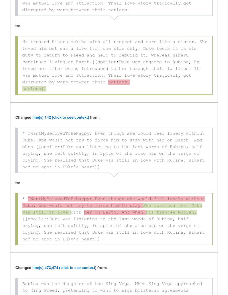الحذف: تمادى صاحب التعديل في الحذف لدرجة حذف كل ما كتب عن ثلاث شخصيات ذات صلة بهيكارو ماكيبا دون سبب، إلى جانب حذف استعارات الأميرة روبينا والذي يشير لعدم مصداقية من قام بالتعديل، وافتقاره للخبرة الكافية لمضاهاة كاتب الموضوع الأصلي.