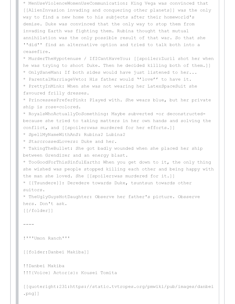 * HeelFaceTurn: Sort of. He never was evil, but he convinced himself of the Vegans were friendly and whoever piloted Grendizer was the bad guy who was preventing humans from meeting people from other planets. He made considerable exercises of mental gymnastics to keep himself deluded from the truth until he was unable to deny the facts. Remarkably, he finally woke up when his daughter was in danger.