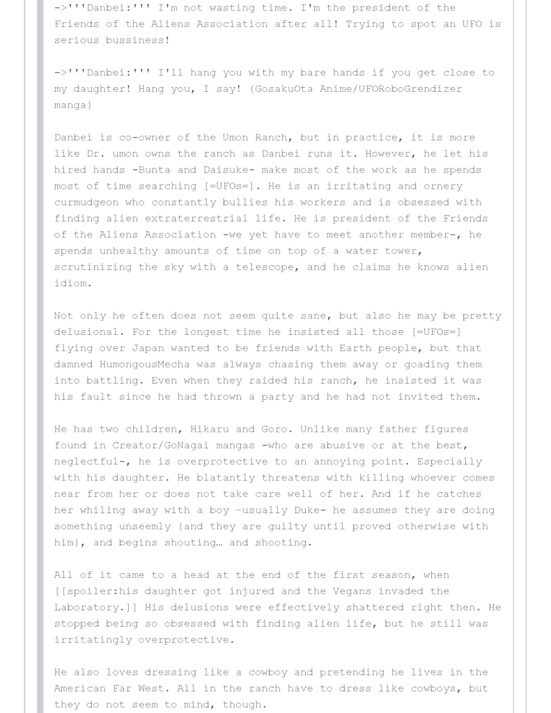Danbei is co-owner of the Umon Ranch, but in practice, it is more like Dr. umon owns the ranch as Danbei runs it. However, he let his hired hands -Bunta and Daisuke- make most of the work as he spends most of time searching [=UFOs=]. He is an irritating and ornery curmudgeon who constantly bullies his workers and is obsessed with finding alien extraterrestrial life. He is president of the Friends of the Aliens Association -we yet have to meet another member-, he spends unhealthy amounts of time on top of a water tower, scrutinizing the sky with a telescope, and he claims he knows alien idiom.