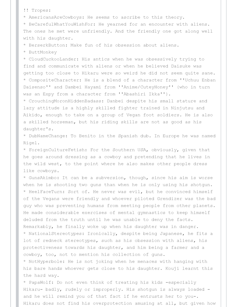 * PapaWolf: Do not even think of treating his kids -especially Hikaru- badly, rudely or improperly. His shotgun is always loaded -and he will remind you of that fact if he entrusts her to you-. Hikaru does not find his overprotection amusing at all, but given how parents of giant robot pilots ”[[Anime/MazingerZ tend]]” ”[[Anime/MobileSuitGundam to]]” ”[[Anime/NeonGenesisEvangelion be]]”, maybe she should be more patient.