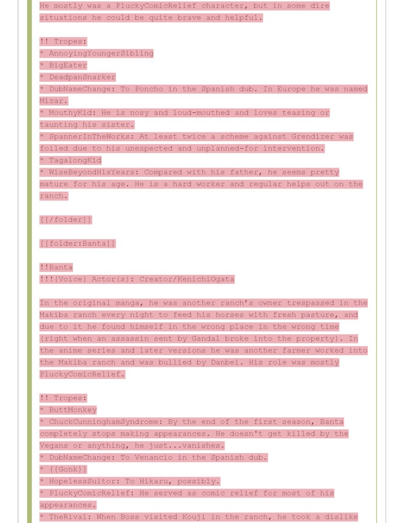 In the original manga, he was another ranch’s owner trespassed in the Makiba ranch every night to feed his horses with fresh pasture, and due to it he found himself in the wrong place in the wrong time (right when an assassin sent by Gandal broke into the property). In the anime series and later versions he was another farmer worked into the Makiba ranch and was bullied by Danbei. His role was mostly PluckyComicRelief.